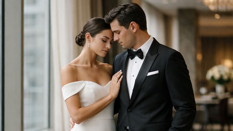 A structured gown, a well-fitted tuxedo, and understated jewelry always photograph beautifully.